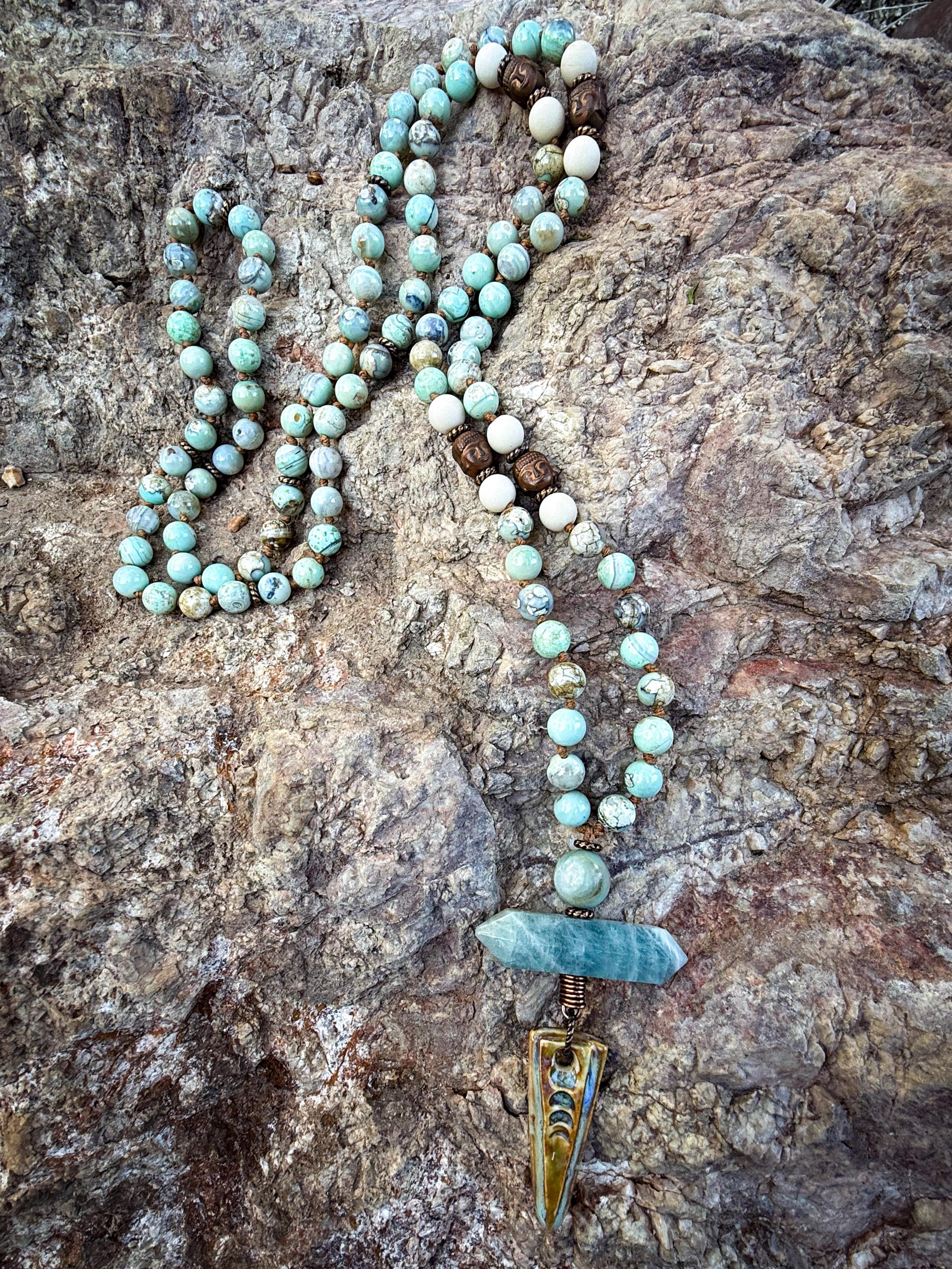 Water Realm Mala: Aqua Terra Agate, Fossil Jasper, Aquamarine Point, Amazonite Guru & Copper Accents