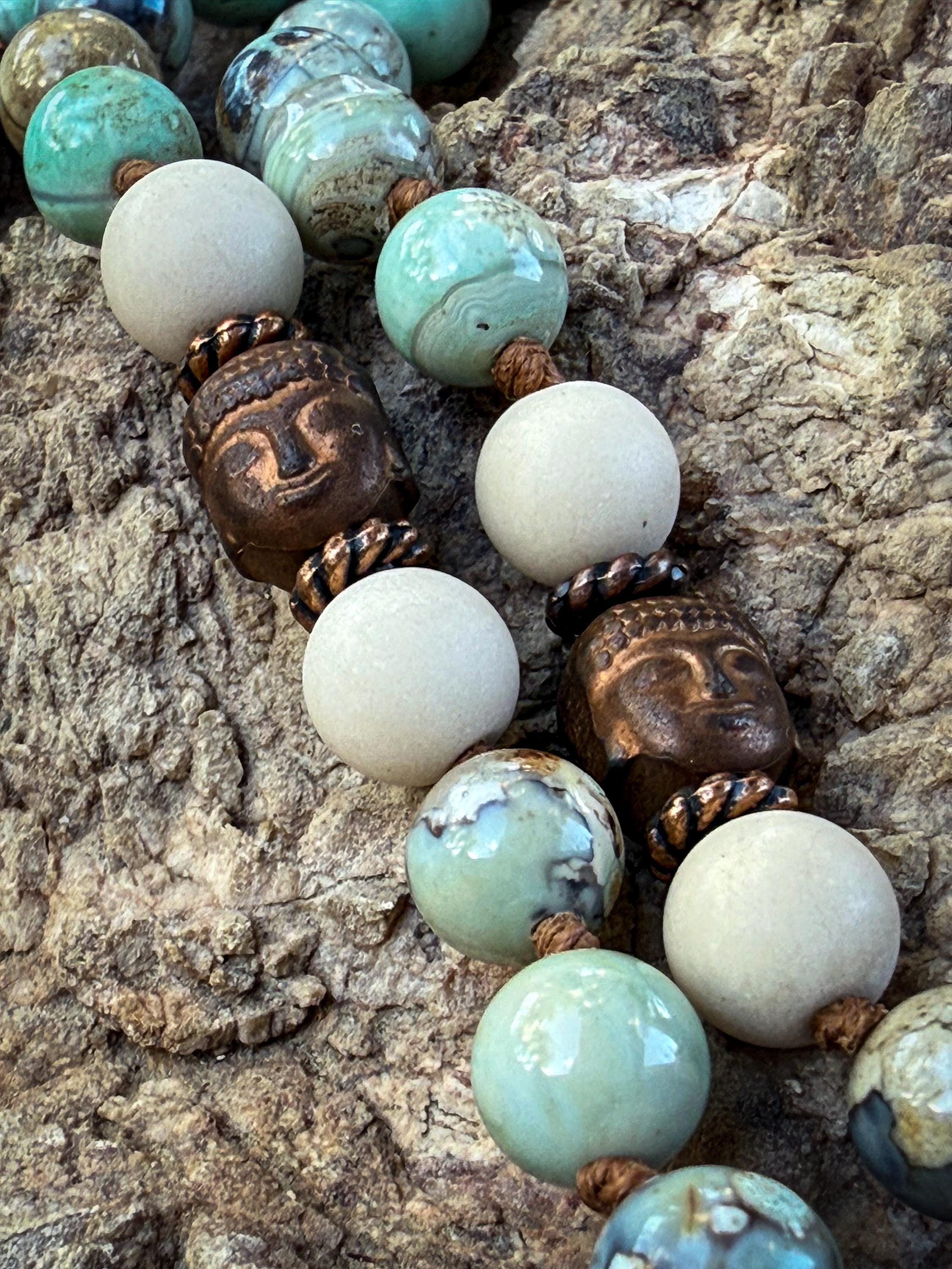 Beads: Features 8mm Aqua Terra agate in seafoam, cream, and earthy marbled tones, paired with matte fossil jasper river stone for grounding and balance. Also includes 10mm bronze titanium-coated hematite Buddha head beads for added protection, strength, and stabilizing energy.