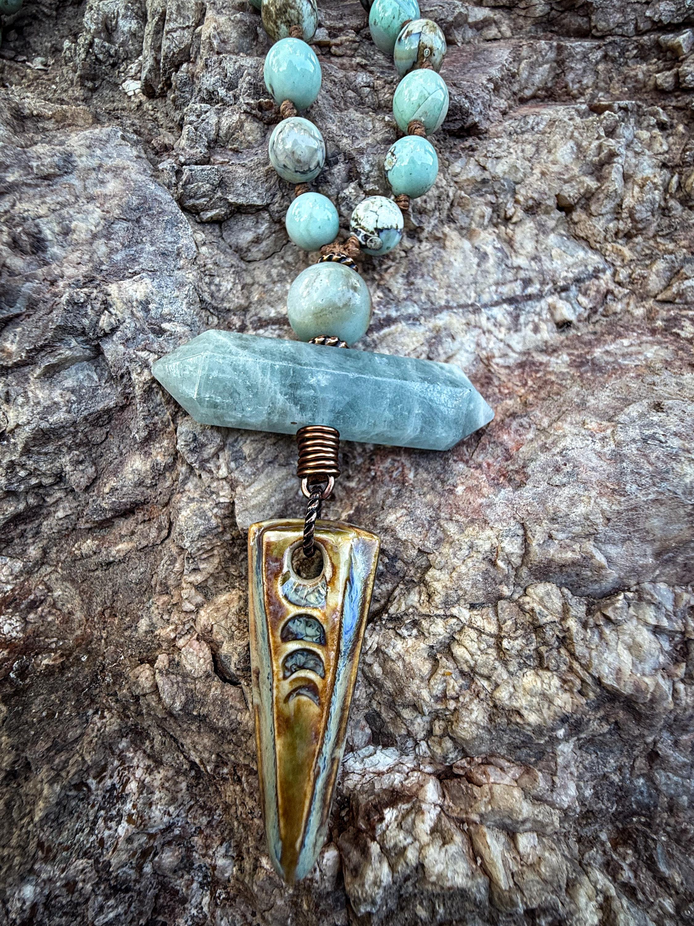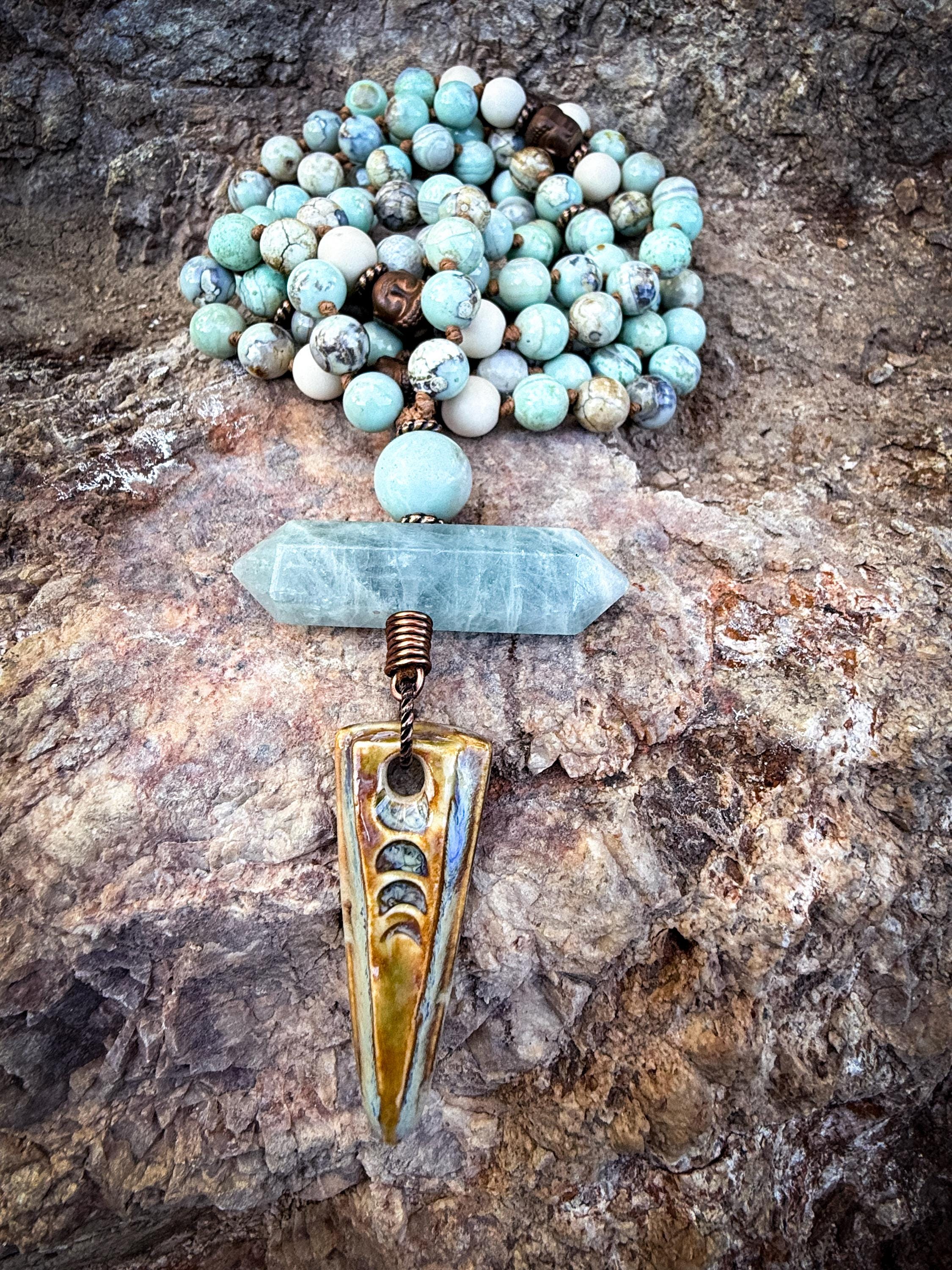 Aqua Terra agate offers the marbled beauty of water meeting land, while fossil jasper and matte river stone provide a steady, earthy foundation. Bronze Buddha beads and warm copper accents add depth and warmth to the design. A smooth 12mm Amazonite guru bead leads into a one-of-a-kind aquamarine double-point pendant paired with a rustic ceramic lunar-phase spike, together symbolizing flow, intuition, and quiet strength.
