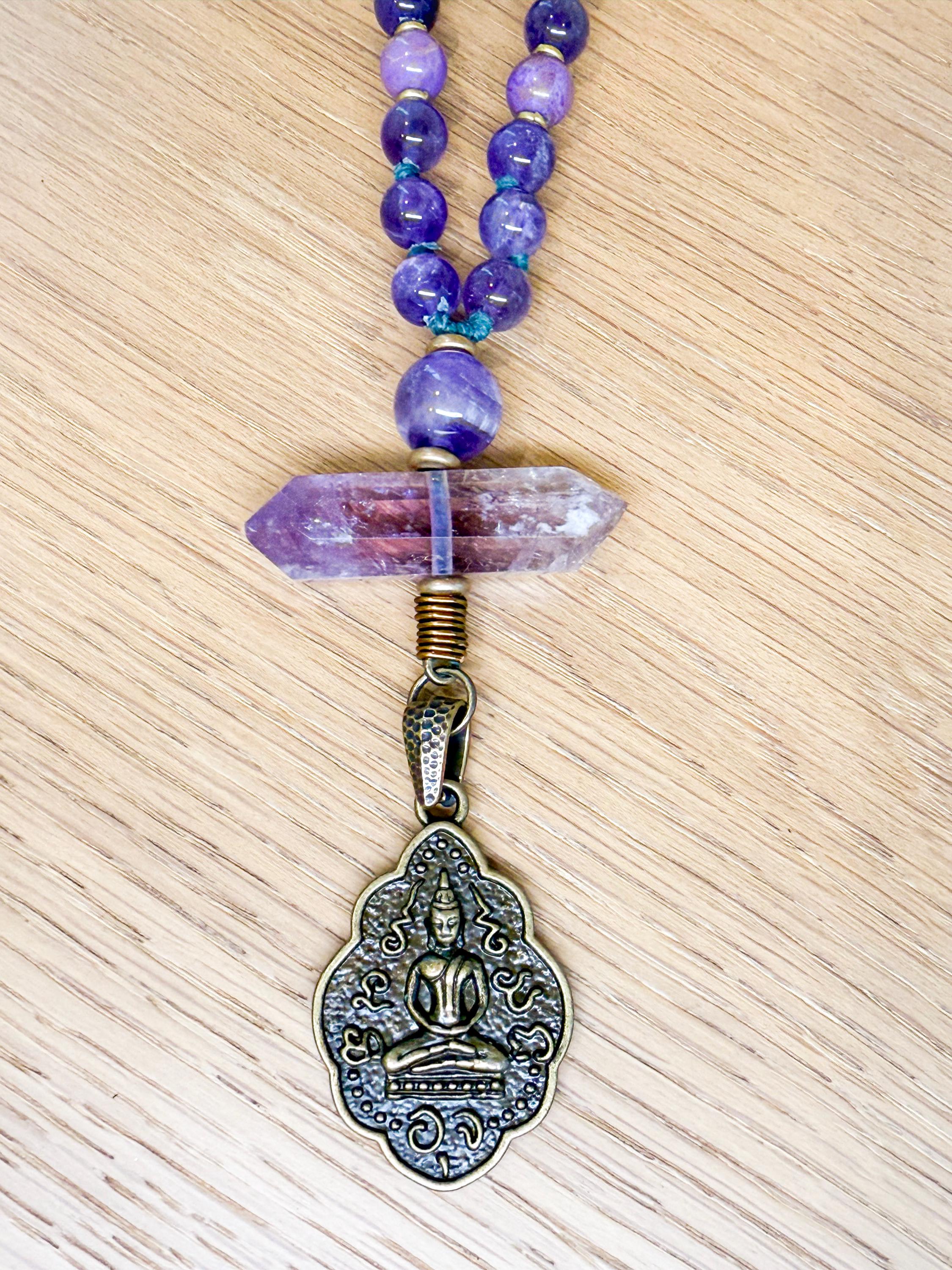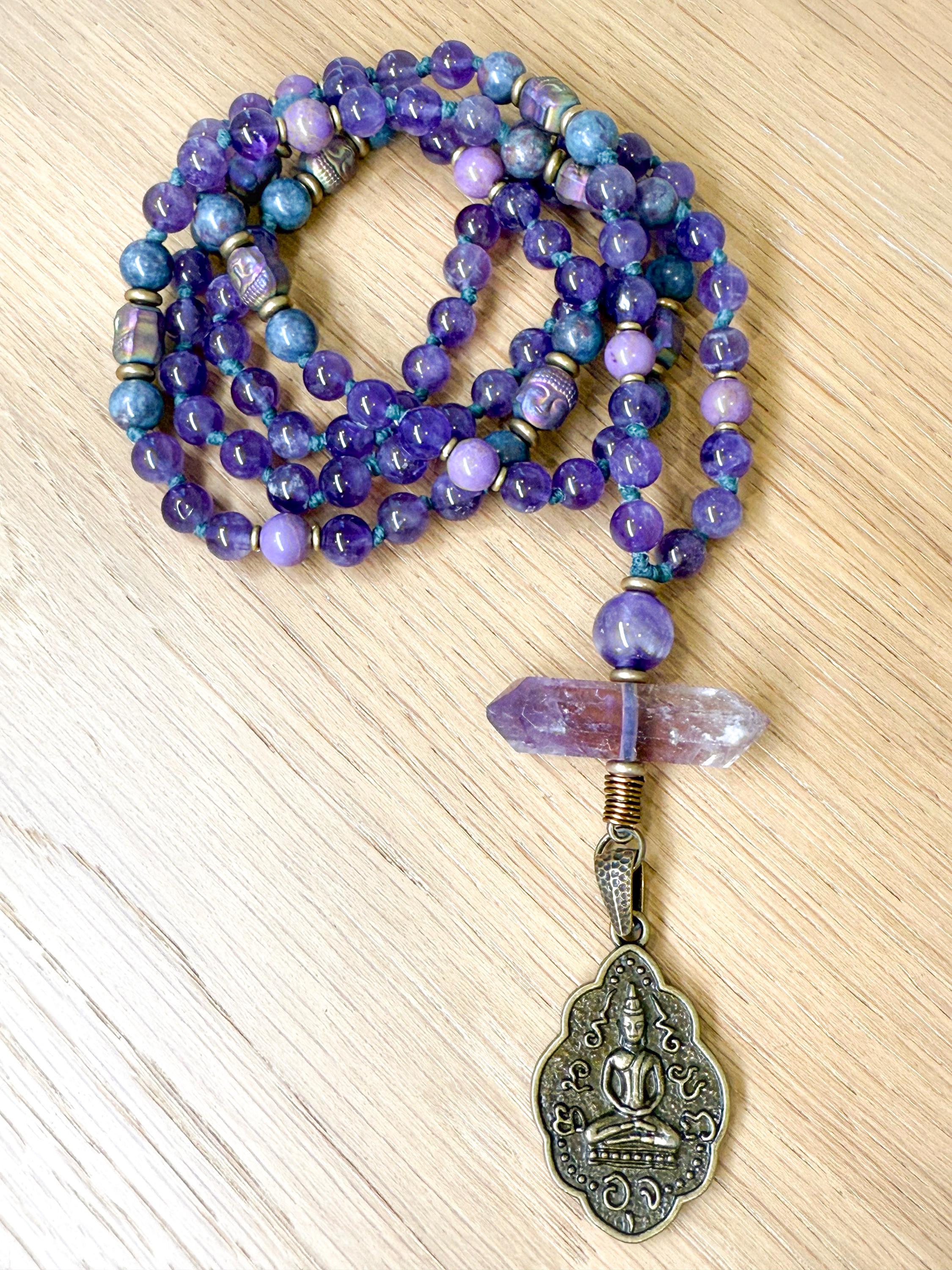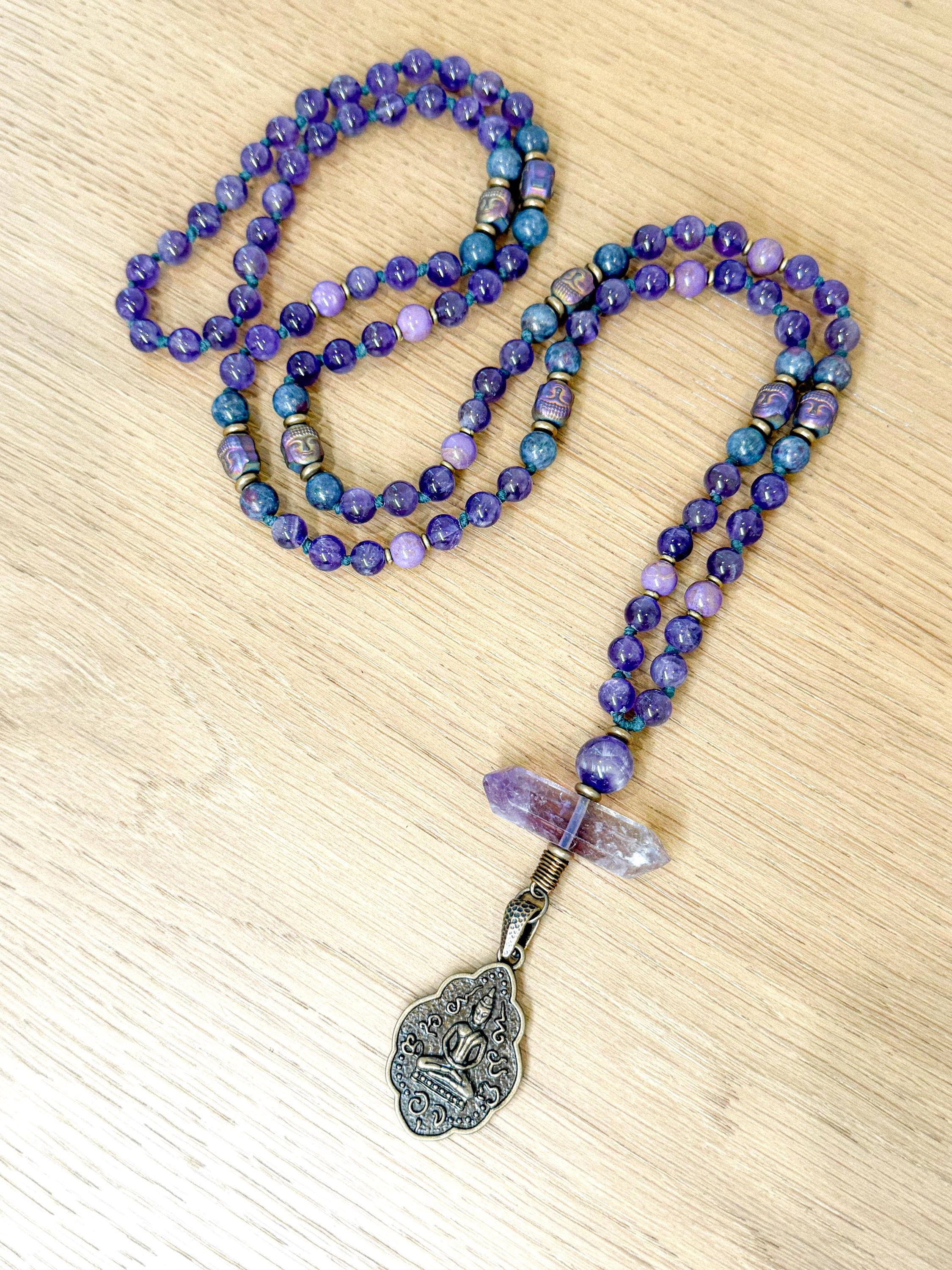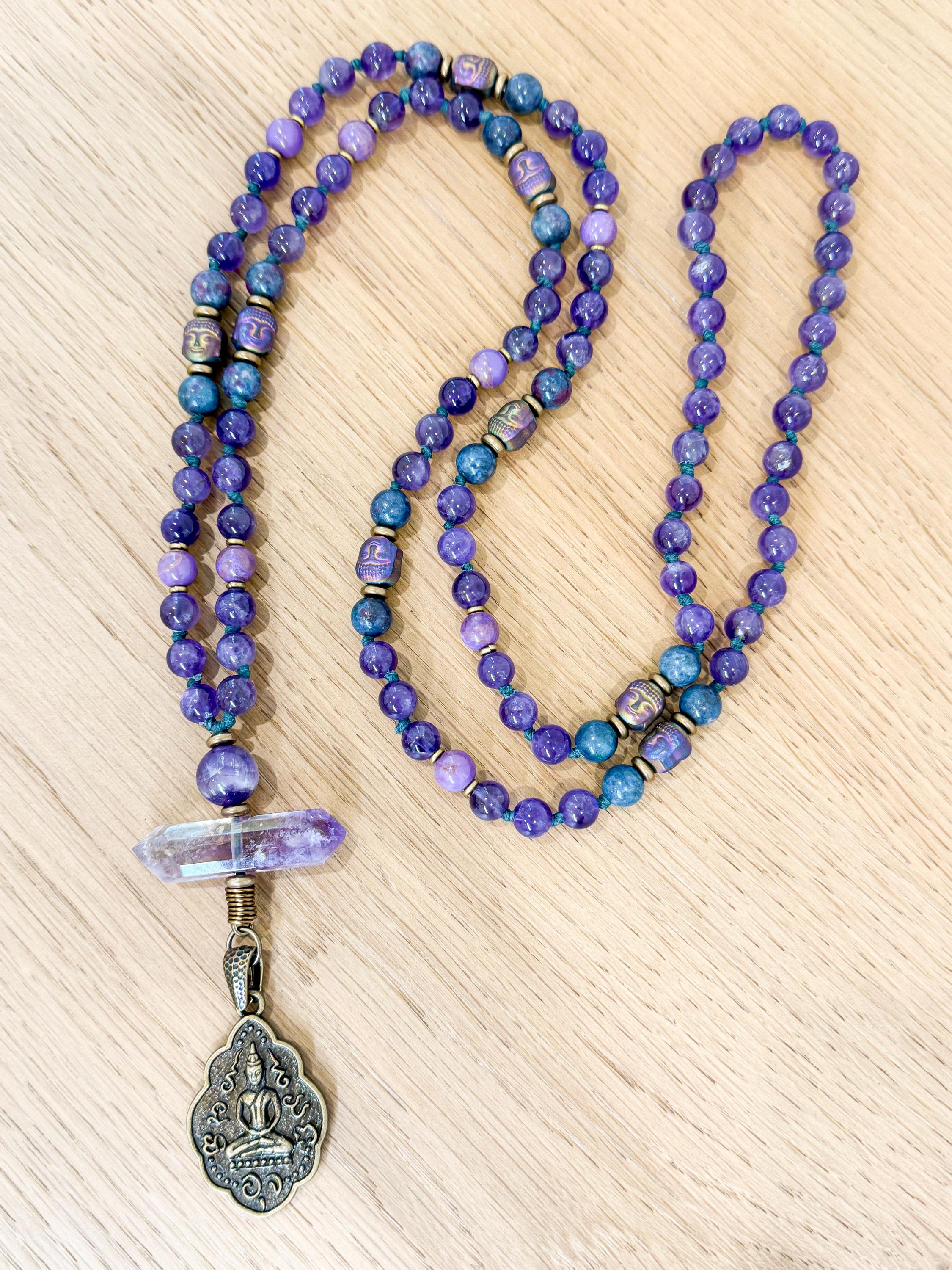 Meticulously knotted by hand, this mala features luminous amethyst for serenity and spiritual clarity, rare ruby kyanite for aligned action and integration, and soft lavender phosphosiderite for emotional balance and gentle grounding. Hematite Buddha head beads add a touch of timeless mysticism, while a rare double-terminated ametrine point from Bolivia anchors the design with radiant energy. A beautifully detailed brass sitting Buddha pendant completes the piece, offering a quiet reminder of stillness, compassion, and awakened presence.