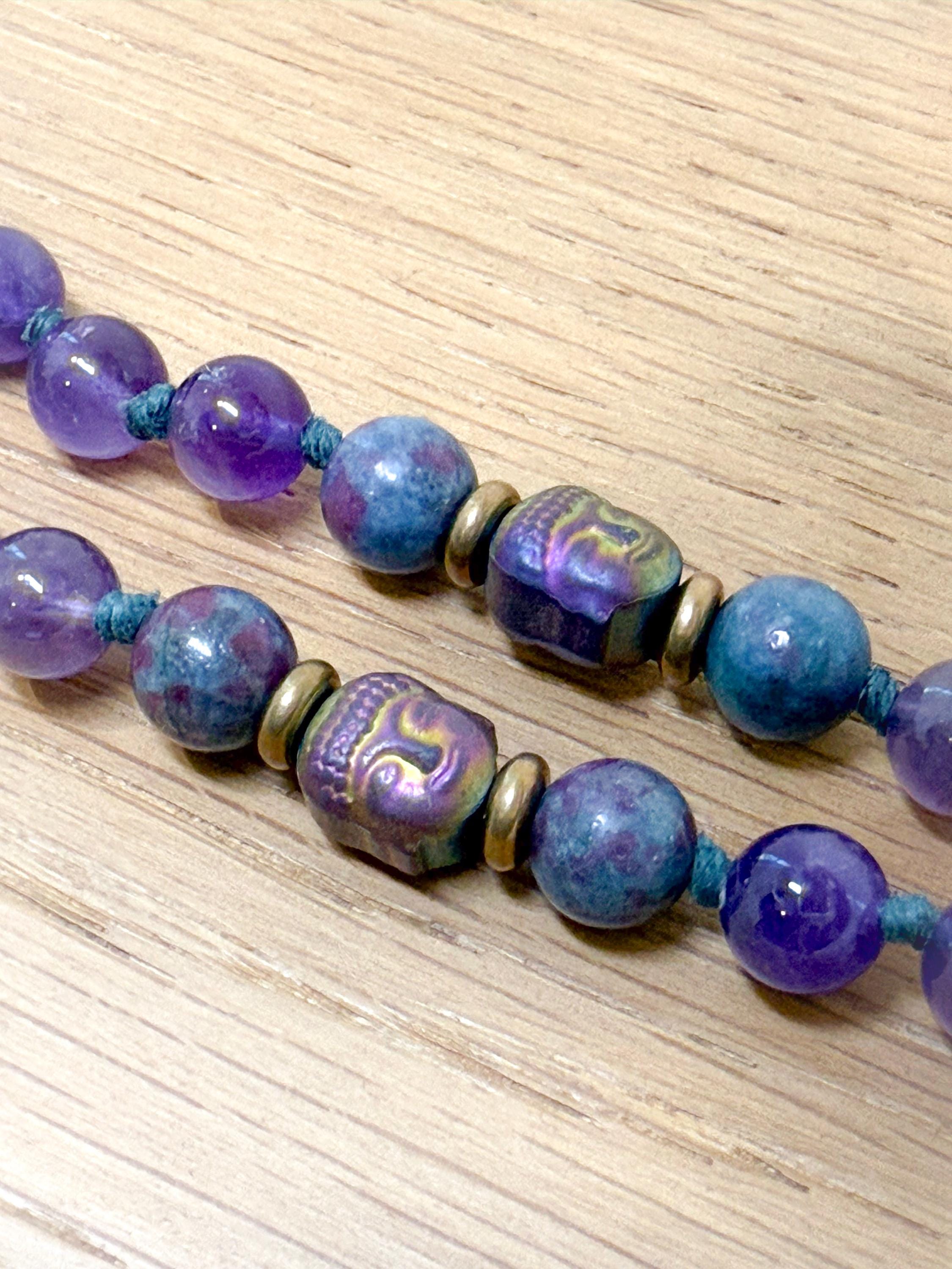 Materials: 8mm Amethyst, Ruby Kyanite, and Phosphosiderite beads and 10mm Rainbow Titanium Hematite Buddha beads