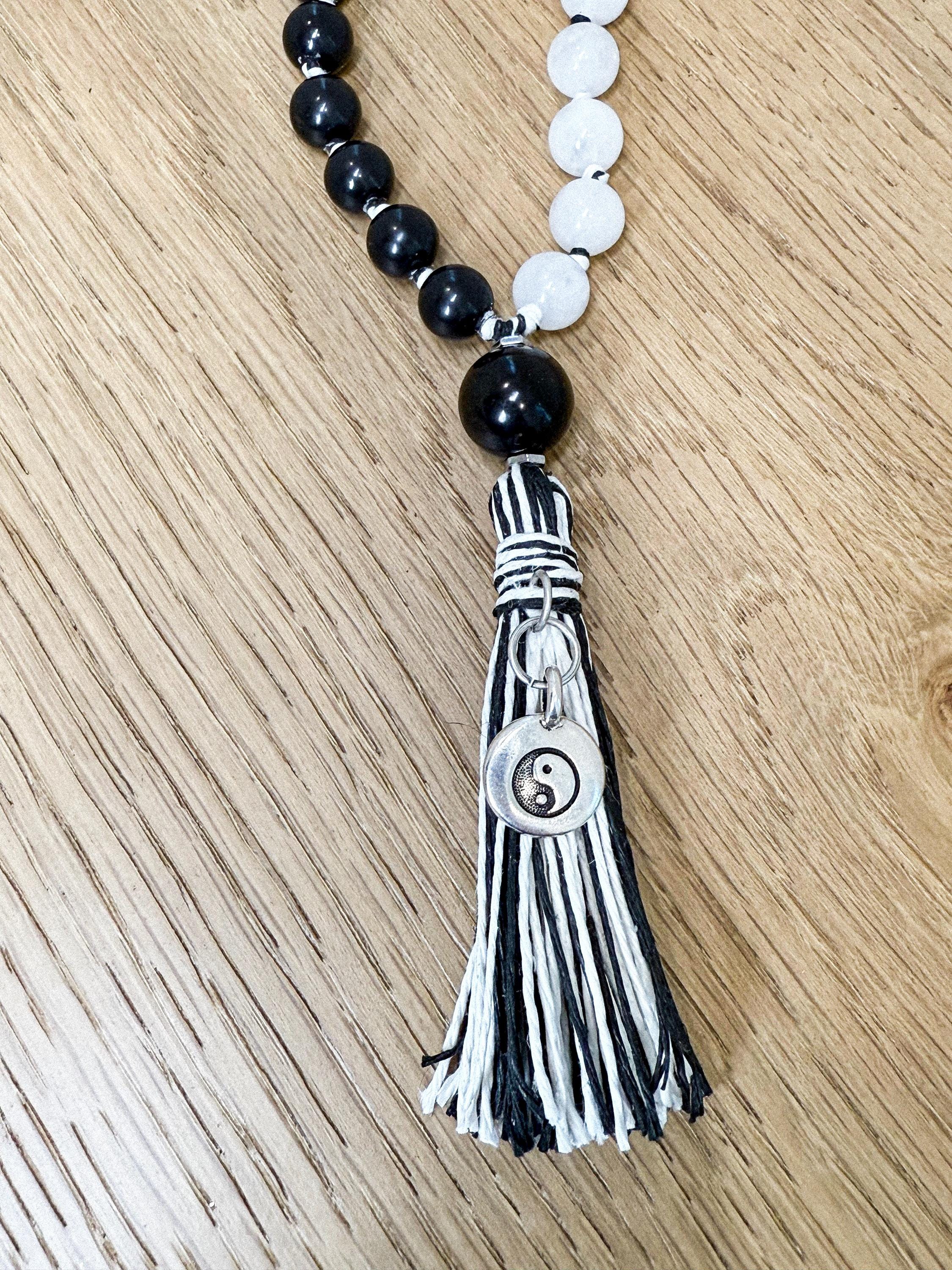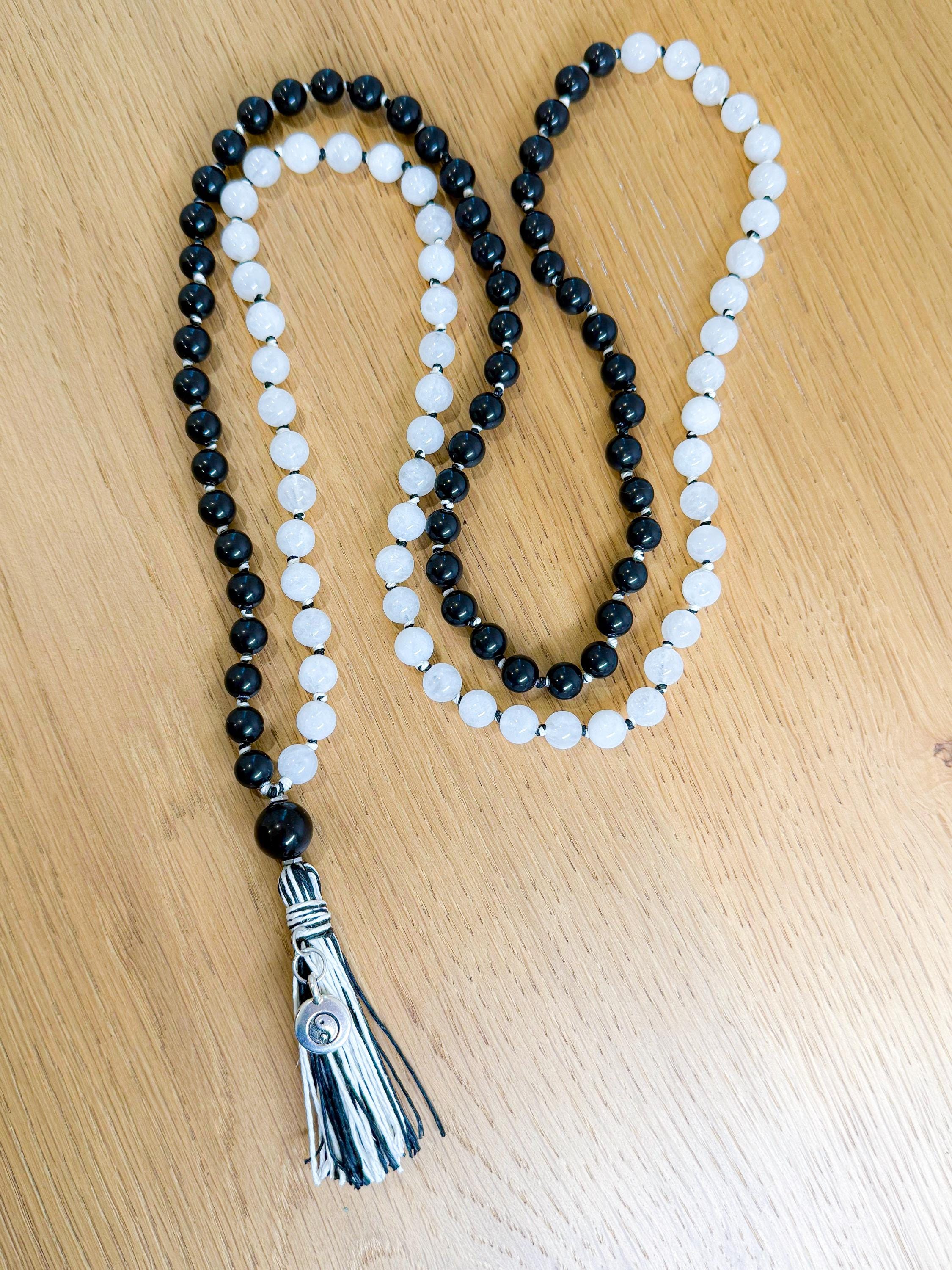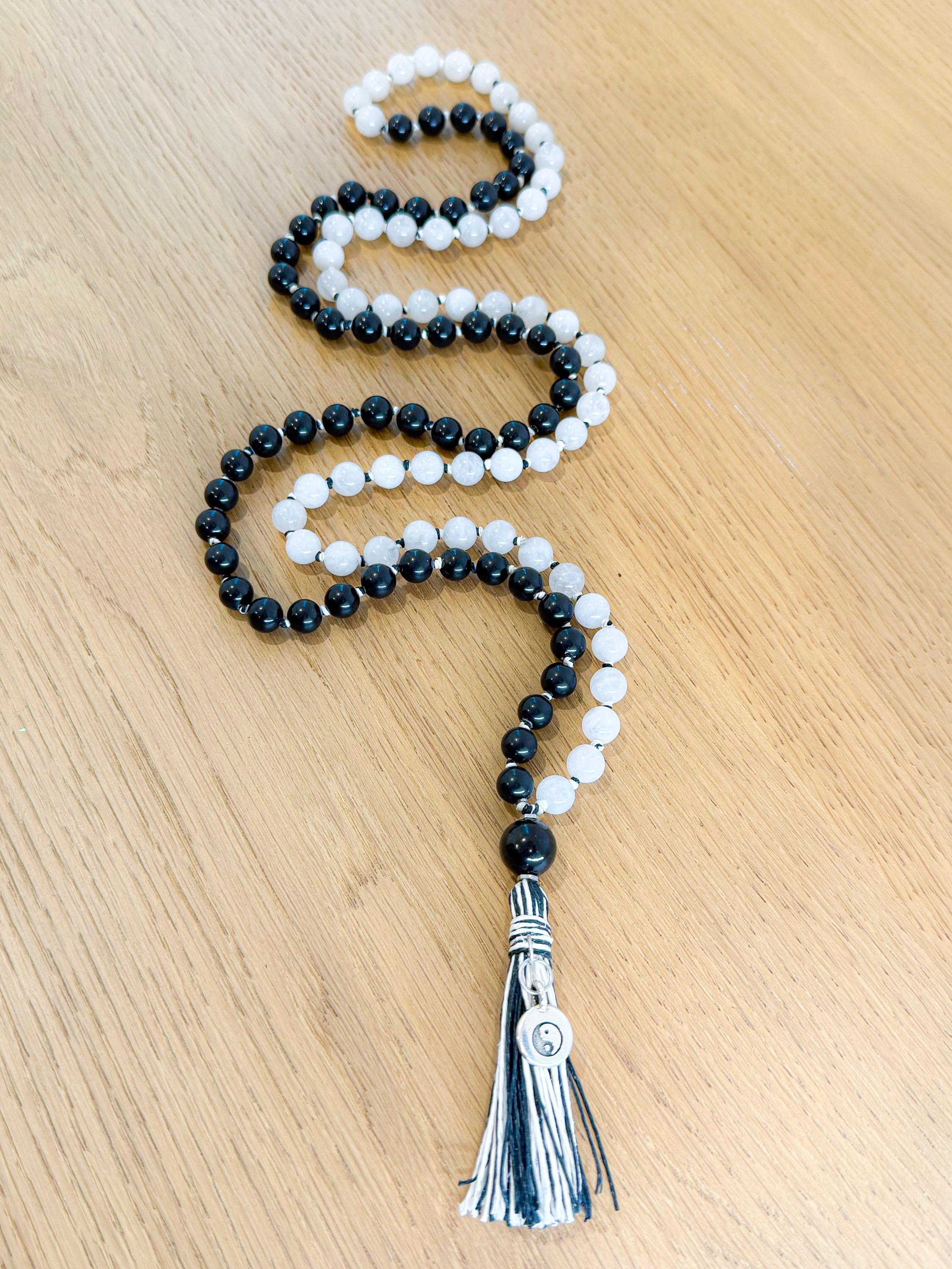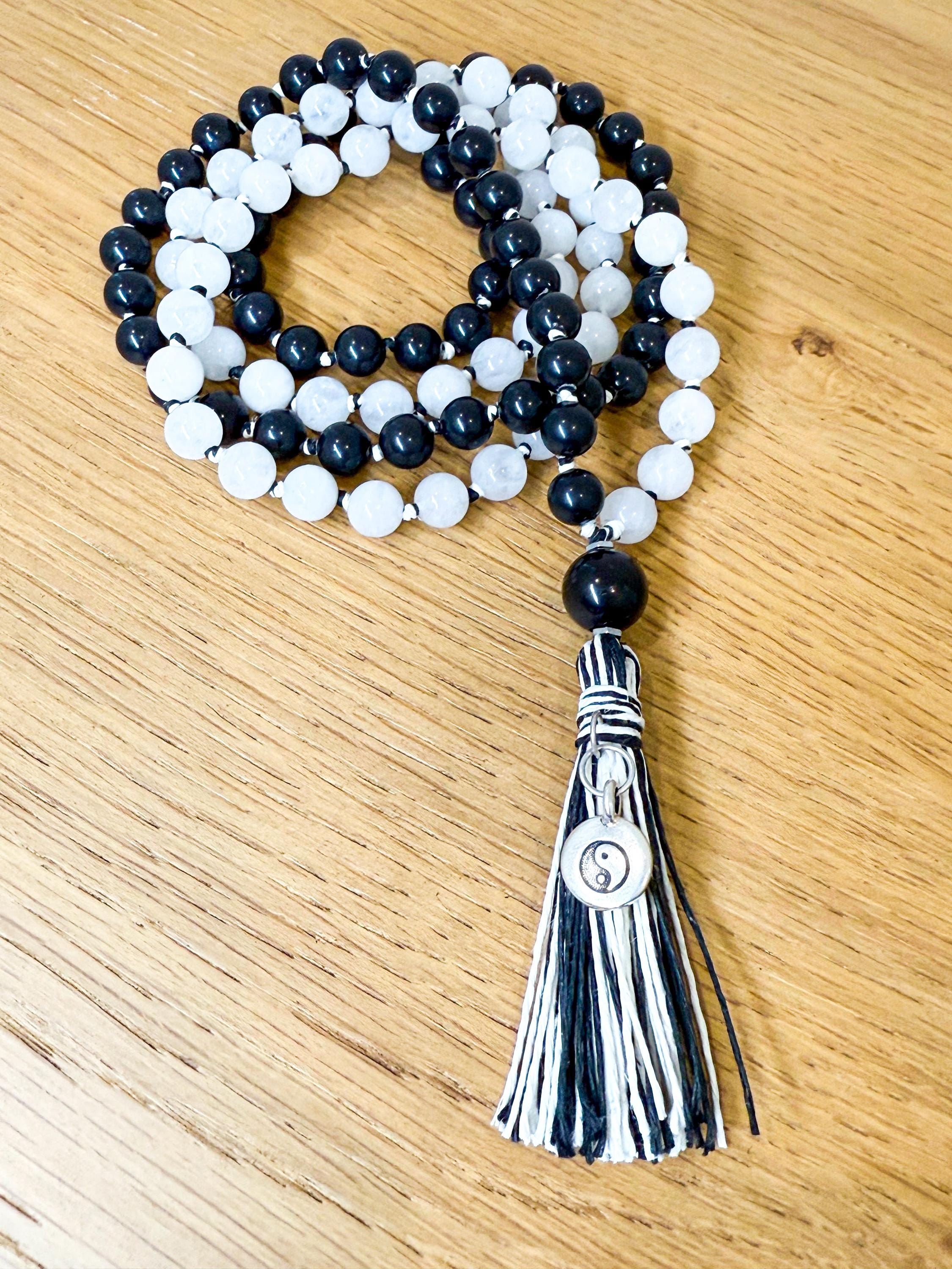 Duality Black & White Gemstone Mala: Brazilian Black Stone, White Jade, Shungite, Silver Yin–Yang Charm