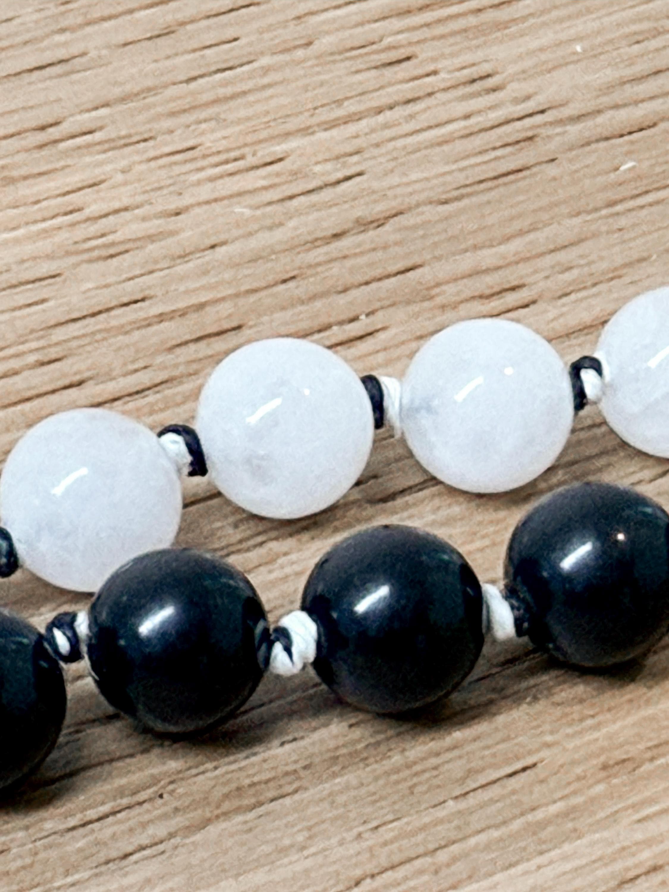 The Duality Mala was created as a quiet reminder that balance is not something we chase but something we cultivate. This piece reflects the natural interplay between opposites: the grounding weight of deep Brazilian black stone on one side and the soft, luminous presence of white jade on the other. Together, they form a gentle rhythm of contrast, offering a visual and energetic expression of harmony.